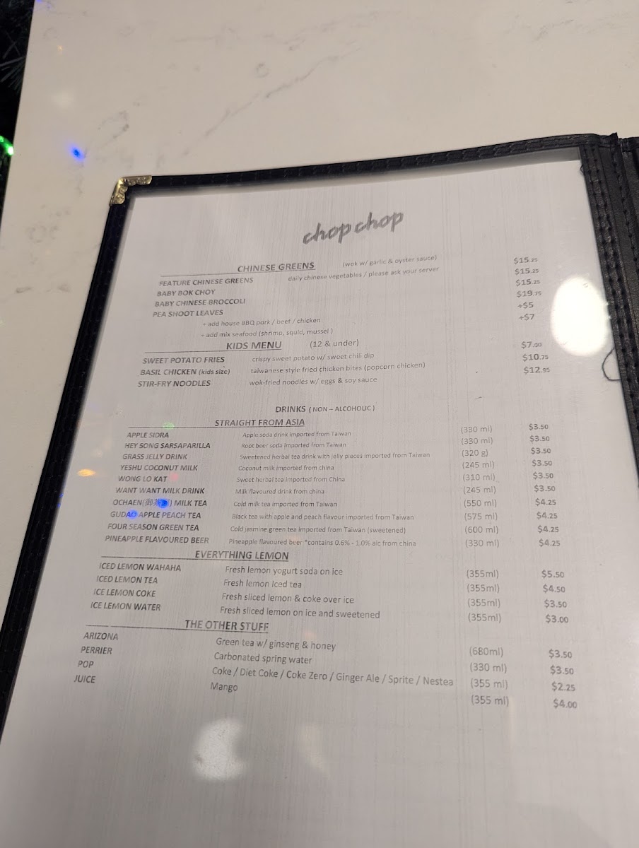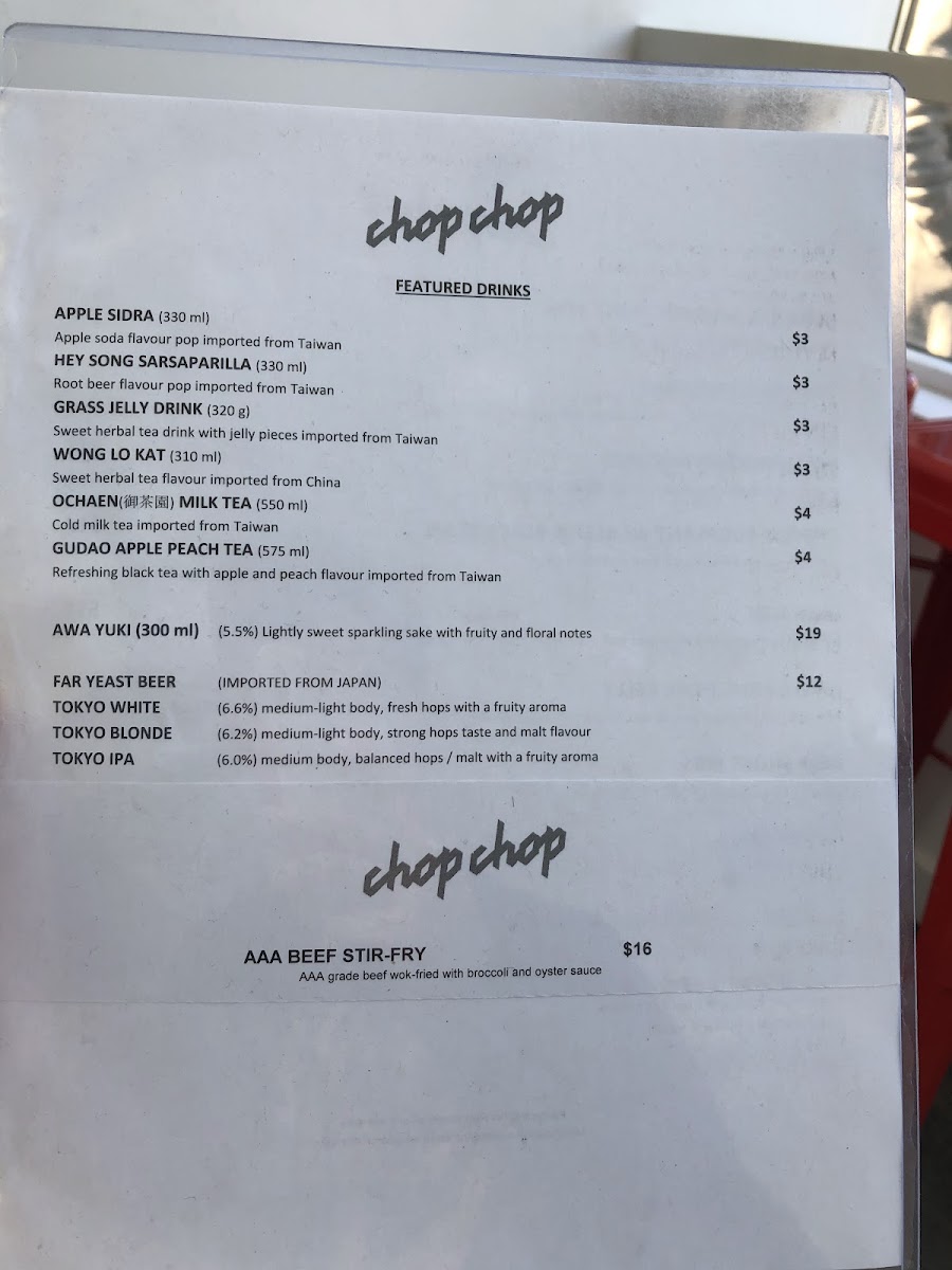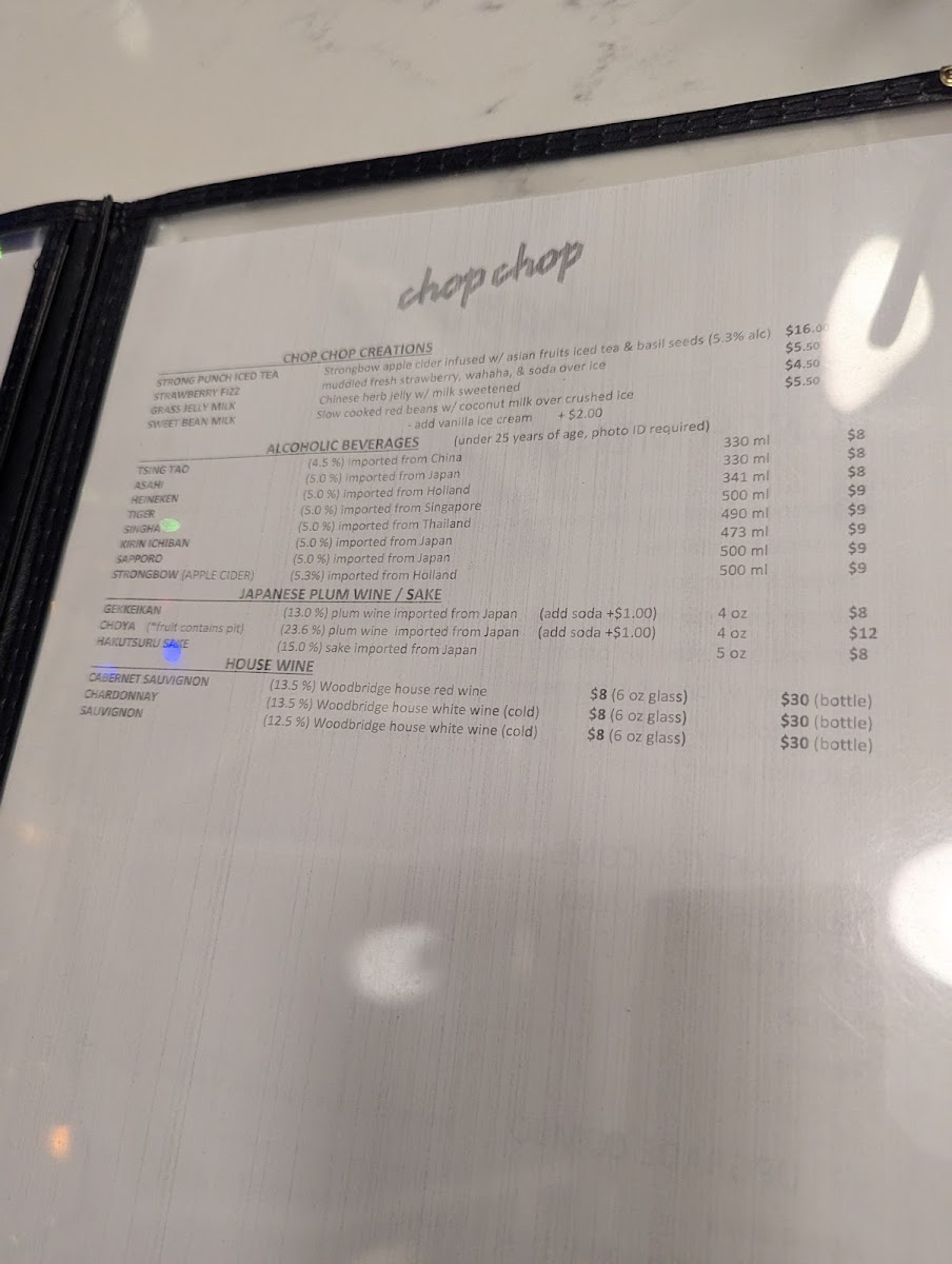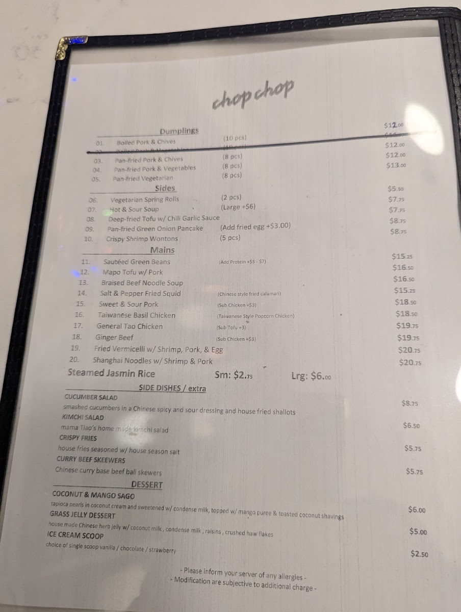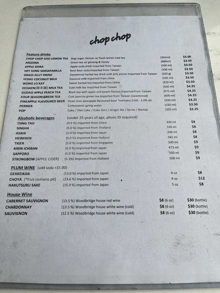 In conclusion, Chop Chop’s menu offers a satisfying blend of classic Chinese comfort food and thoughtful twists that leave a memorable impression. Starting with dumplings, favourites like Boiled Pork and Chives (10pcs) and Pan-Fried Pork and Chives (8pcs) sit alongside options such as Pan-Fried Pork and Vegetable (8pcs) and Pan-Fried Vegetarian (8pcs), setting a high bar right from the first bite. The appetizers showcase both familiar and distinctive choices, from the house‑made tang of Mama Tiao’s Home Made Kimchi to crispy Vegetarian Spring Rolls (2pcs), Deep‑Fried Tofu with Garlic Chili Sauce, and the ever‑popular Pan‑Fried Green Onion Pancake, all complemented by refreshing sides like Spicy Cucumber Salad. For mains, staples like Sauteed Green Beans, Mapo Tofu with Pork, and Braised Beef Noodle Soup deliver hearty satisfaction, while the likes of Salt and Pepper Fried Squid and Sweet and Sour Pork bring a balance of texture and flavour. The featured items are clearly highlights, with signature choices like Feature Fried Rice, Chop Chop “OG” Fried Rice, and Featured Egg Noodles standing out, alongside robust entrees like Stir‑Fried E‑Fu Noodles w/ Seafood and Garlic Chili Chicken w/ Cashew Nuts. Simple but essential sides such as Jasmine Steamed Rice (available in regular and large) round out the meal, and a broad beverage selection - from sodas and premium drinks like Ice Lemon Wahaha and Strawberry Fizz to a respectable list of beers and wines - ensures there’s something for every palate. Whether enjoyed as a quick lunch or a full dinner, the menu at Chop Chop feels both approachable and thoughtfully curated, with bold names and diverse offerings that make it easy to return again and again.