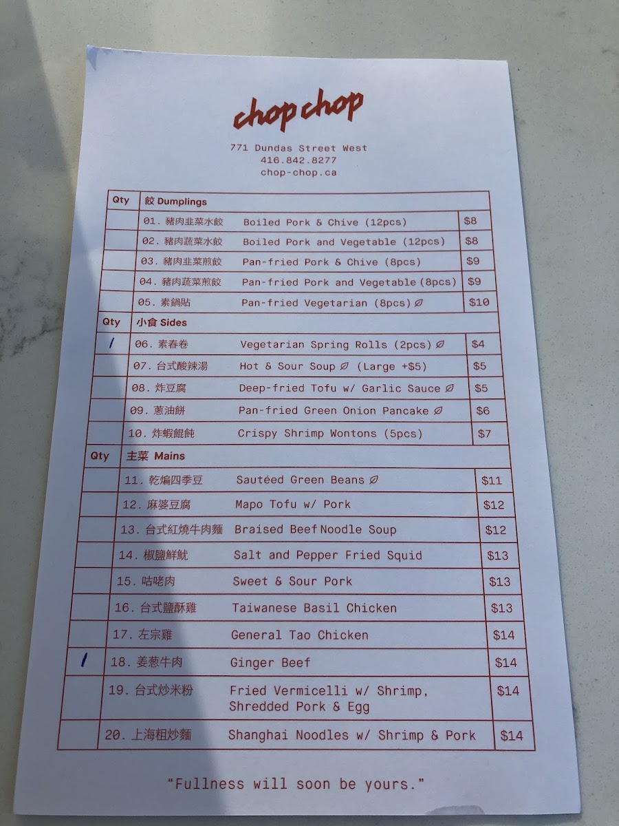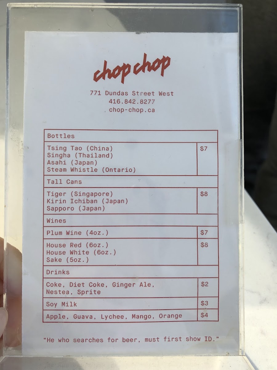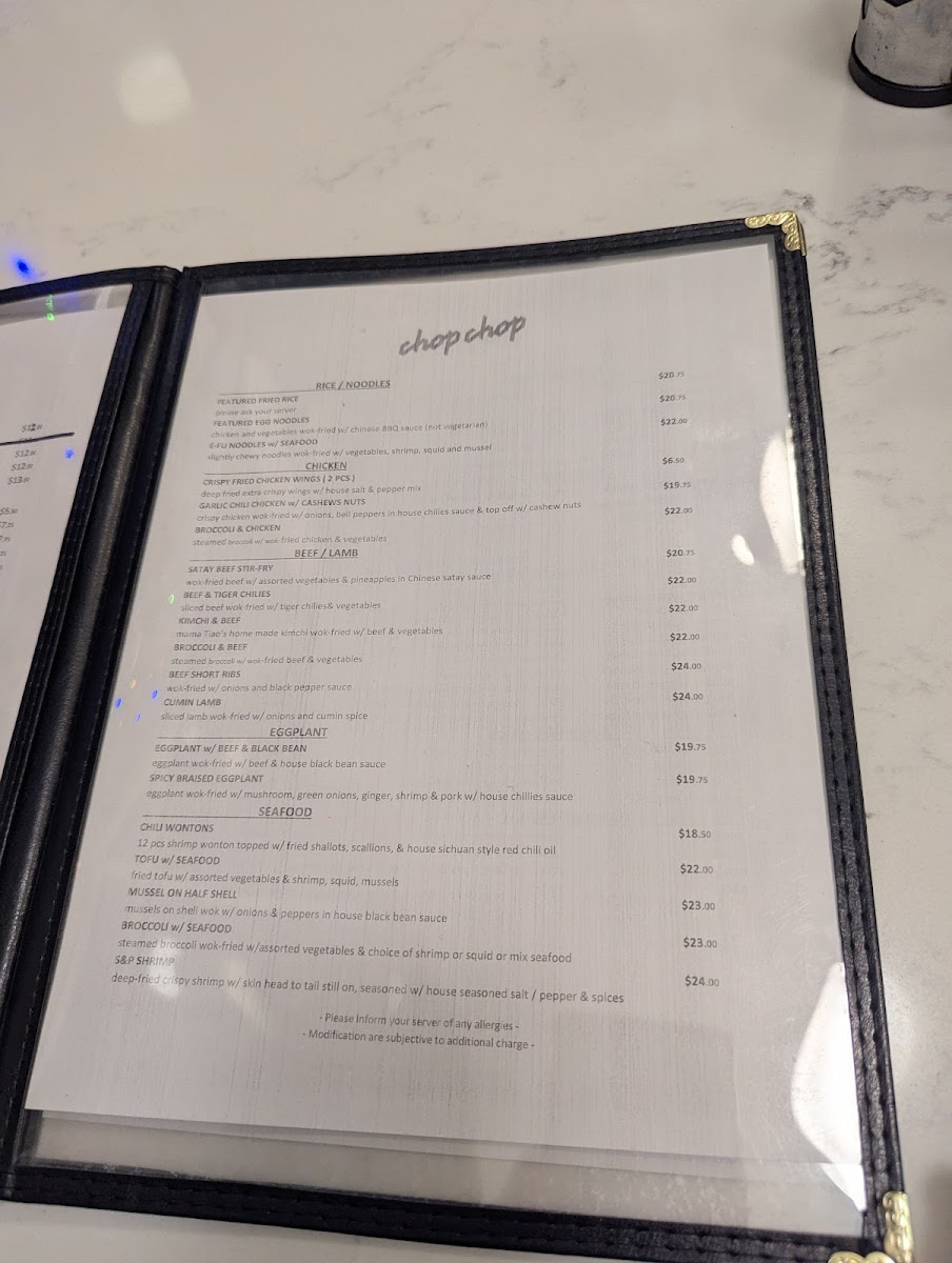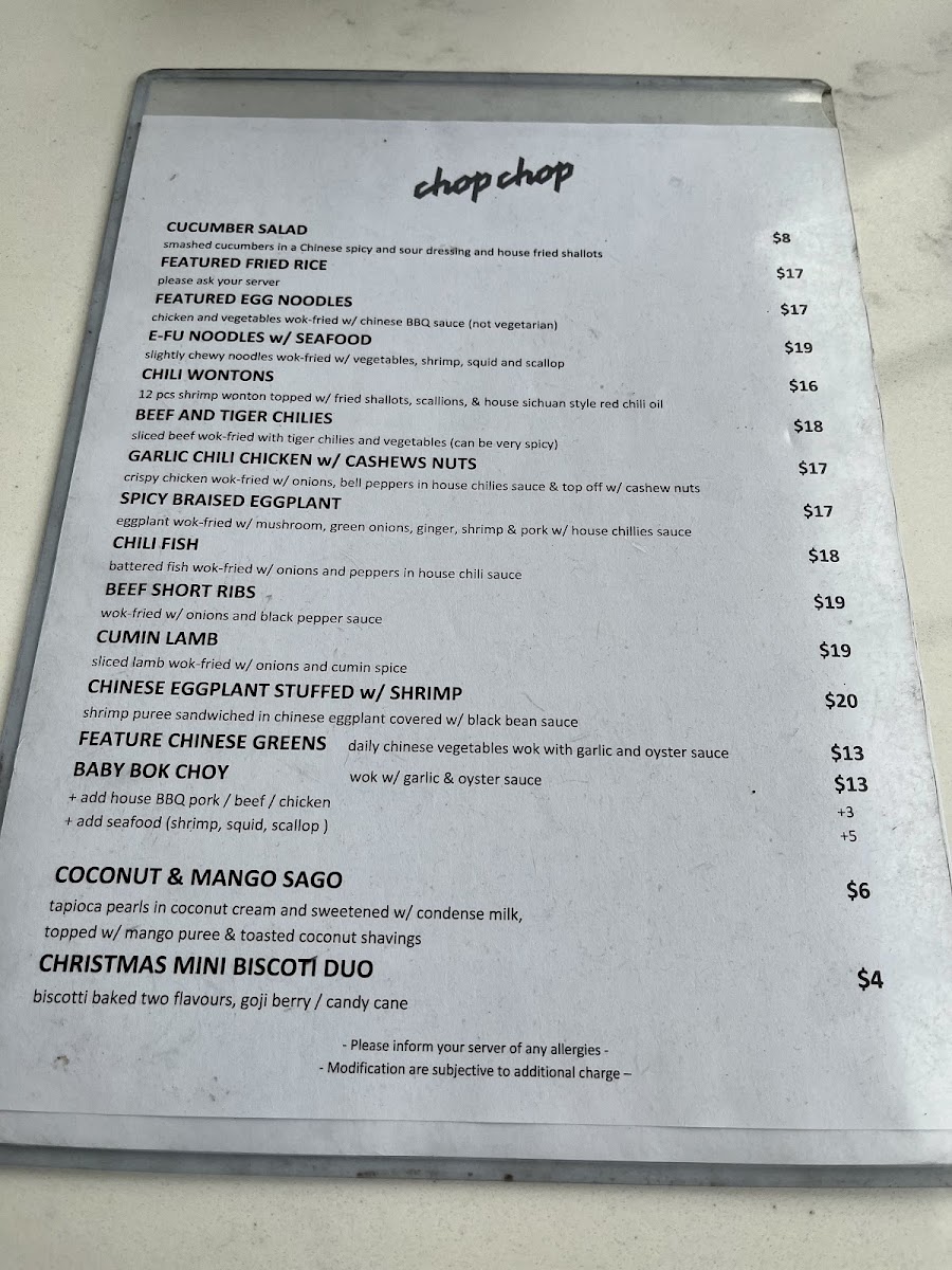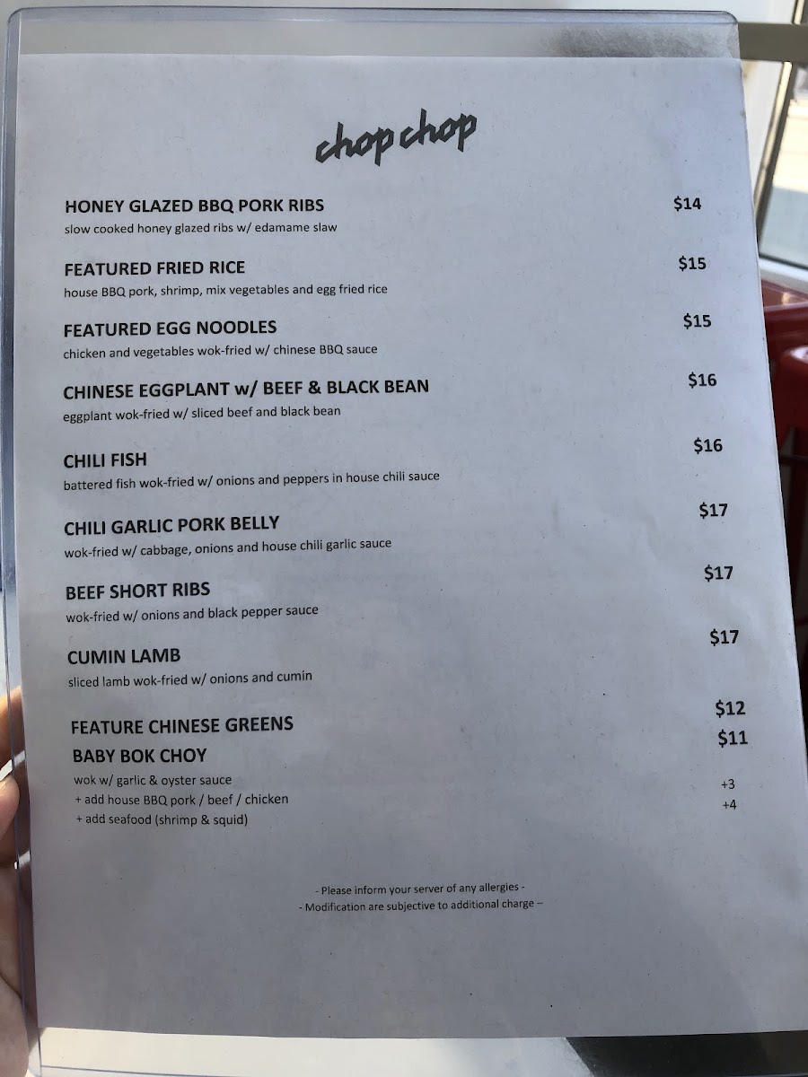 In conclusion, Chop Chop’s menu offers a satisfying blend of classic Chinese comfort food and thoughtful twists that leave a memorable impression. Starting with dumplings, favourites like Boiled Pork and Chives (10pcs) and Pan-Fried Pork and Chives (8pcs) sit alongside options such as Pan-Fried Pork and Vegetable (8pcs) and Pan-Fried Vegetarian (8pcs), setting a high bar right from the first bite. The appetizers showcase both familiar and distinctive choices, from the house‑made tang of Mama Tiao’s Home Made Kimchi to crispy Vegetarian Spring Rolls (2pcs), Deep‑Fried Tofu with Garlic Chili Sauce, and the ever‑popular Pan‑Fried Green Onion Pancake, all complemented by refreshing sides like Spicy Cucumber Salad. For mains, staples like Sauteed Green Beans, Mapo Tofu with Pork, and Braised Beef Noodle Soup deliver hearty satisfaction, while the likes of Salt and Pepper Fried Squid and Sweet and Sour Pork bring a balance of texture and flavour. The featured items are clearly highlights, with signature choices like Feature Fried Rice, Chop Chop “OG” Fried Rice, and Featured Egg Noodles standing out, alongside robust entrees like Stir‑Fried E‑Fu Noodles w/ Seafood and Garlic Chili Chicken w/ Cashew Nuts. Simple but essential sides such as Jasmine Steamed Rice (available in regular and large) round out the meal, and a broad beverage selection - from sodas and premium drinks like Ice Lemon Wahaha and Strawberry Fizz to a respectable list of beers and wines - ensures there’s something for every palate. Whether enjoyed as a quick lunch or a full dinner, the menu at Chop Chop feels both approachable and thoughtfully curated, with bold names and diverse offerings that make it easy to return again and again.